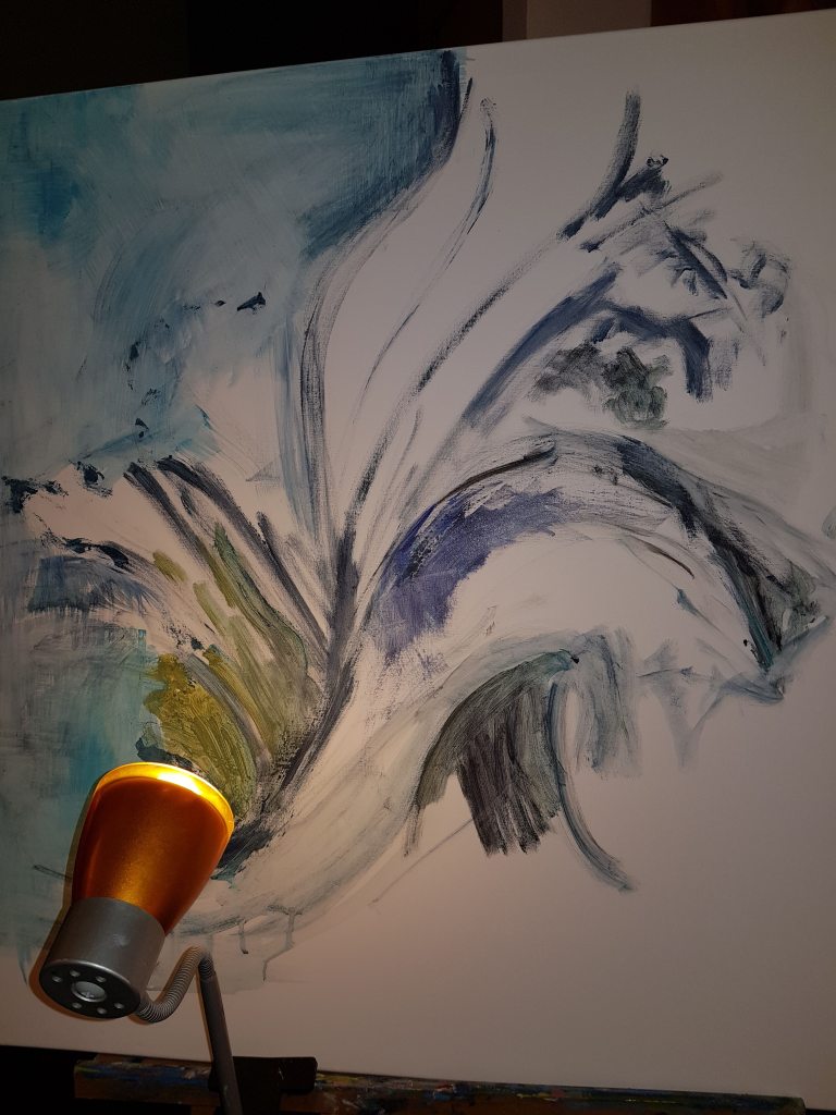 Parfois et même souvent j’ai peint de nuit avec très peu d’éclairage. Dans cette situation il est quasiment impossible de préjuger de ce que cela donnera de jour, mais j’ai souvent remarqué que de jour je redécouvrais mon travail avec un tout nouvel oeil, les couleurs beaucoup plus forcées, plus éclatantes et aussi plus de liberté au niveau du sujet, comme une libération psychique soufflant tout bas « allez lâche toi, qu’as tu à perdre, tu verras demain où cela te mène ».