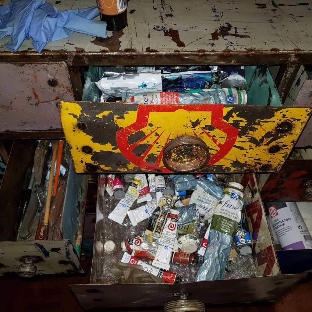 Ma palette est à l’image de ma peinture, colorée, acidulée, presque organisée comme un tableau ayant sa part d’existence en tant que tel.